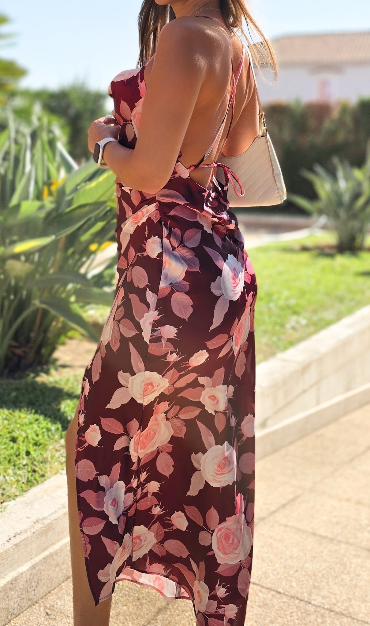 Vestido com padrão e racha do lado esquerdo.